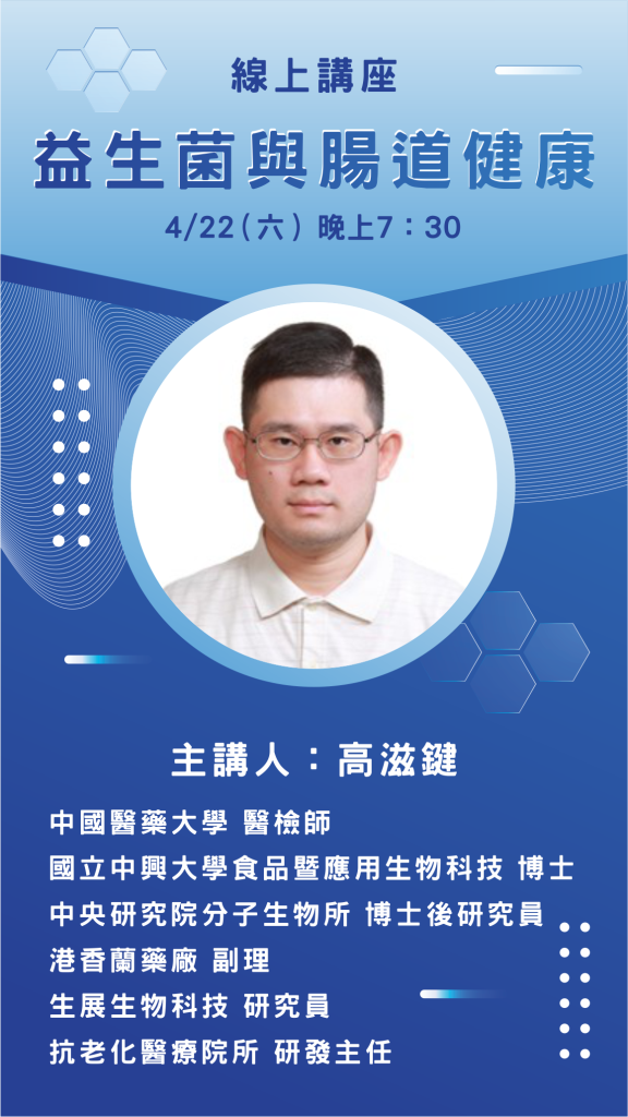 健康講座-益生菌與腸道健康 高滋鍵博士 發佈留言 / 健康講座 / 作者: EVAN 此次主題將聘請 高滋鍵 食品營養博士暨專業醫檢師 演講『益生菌與腸道健康』主題, 針對下列議題來做說明 益生菌的種類與特性 乳酸菌與腸胃道 腸胃道菌相維持腸道平衡 腸內菌相隨著年齡變化 常見之乳酸菌與功能 腸腦軸線 Brain-Gut axis 腸胃道狀況與腦部機能相關 益生菌與神經傳導因子 益生菌選擇 單一菌株&多種菌株 如何腸胃健康補充 益生元種類與特性 後生元的特性 好的腸道保健產品如何選擇 可點擊下方影片進行觀賞,如有需要請教相關問題的話,也可以在官方LINE上留言喔! 最後記得幫我們的官方youtube按讚分享,訂閱開啟小鈴鐺,更豐富的訊息,我們會隨時更新喔