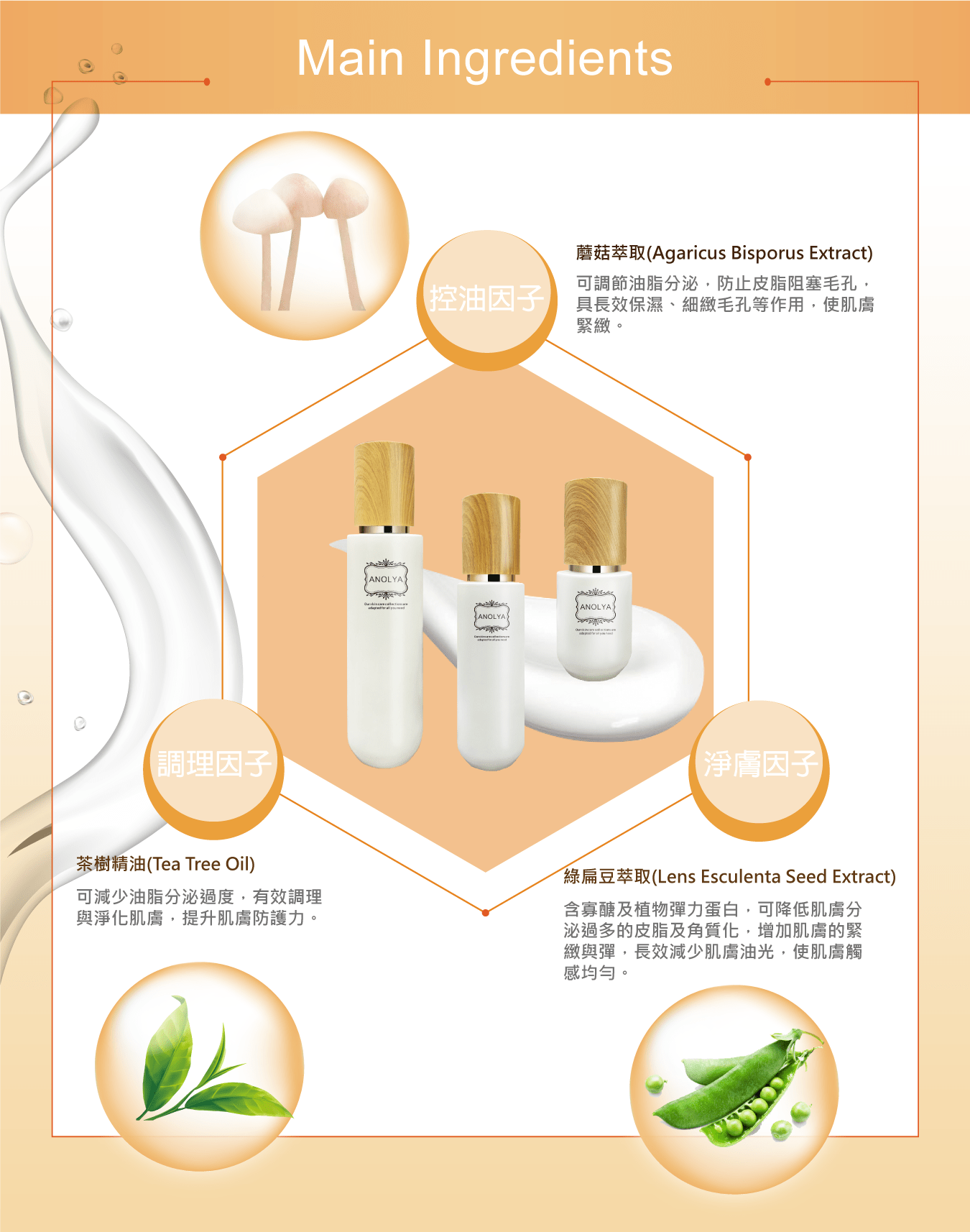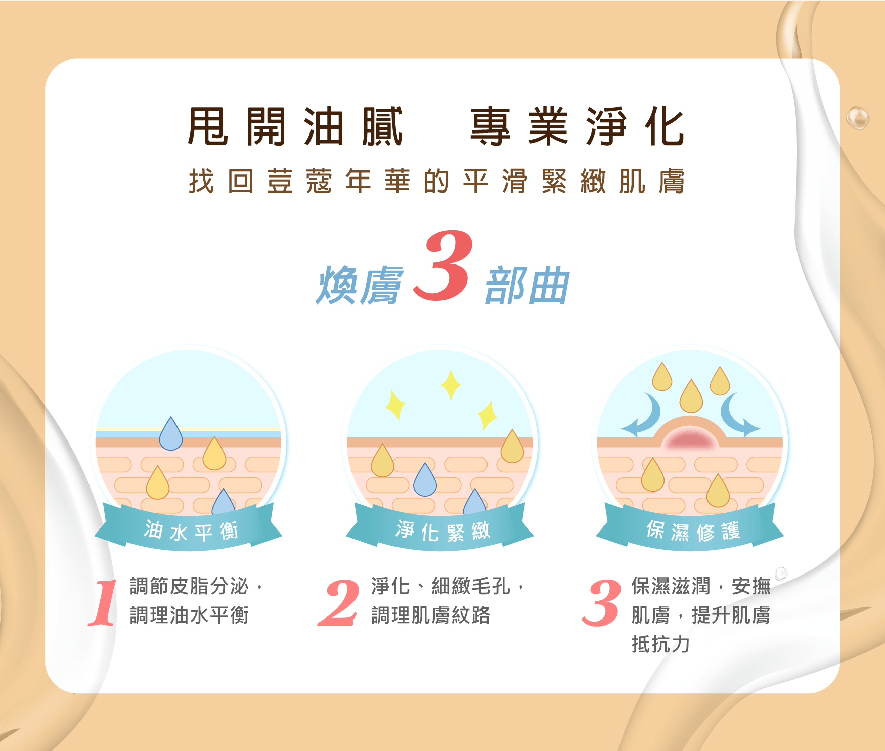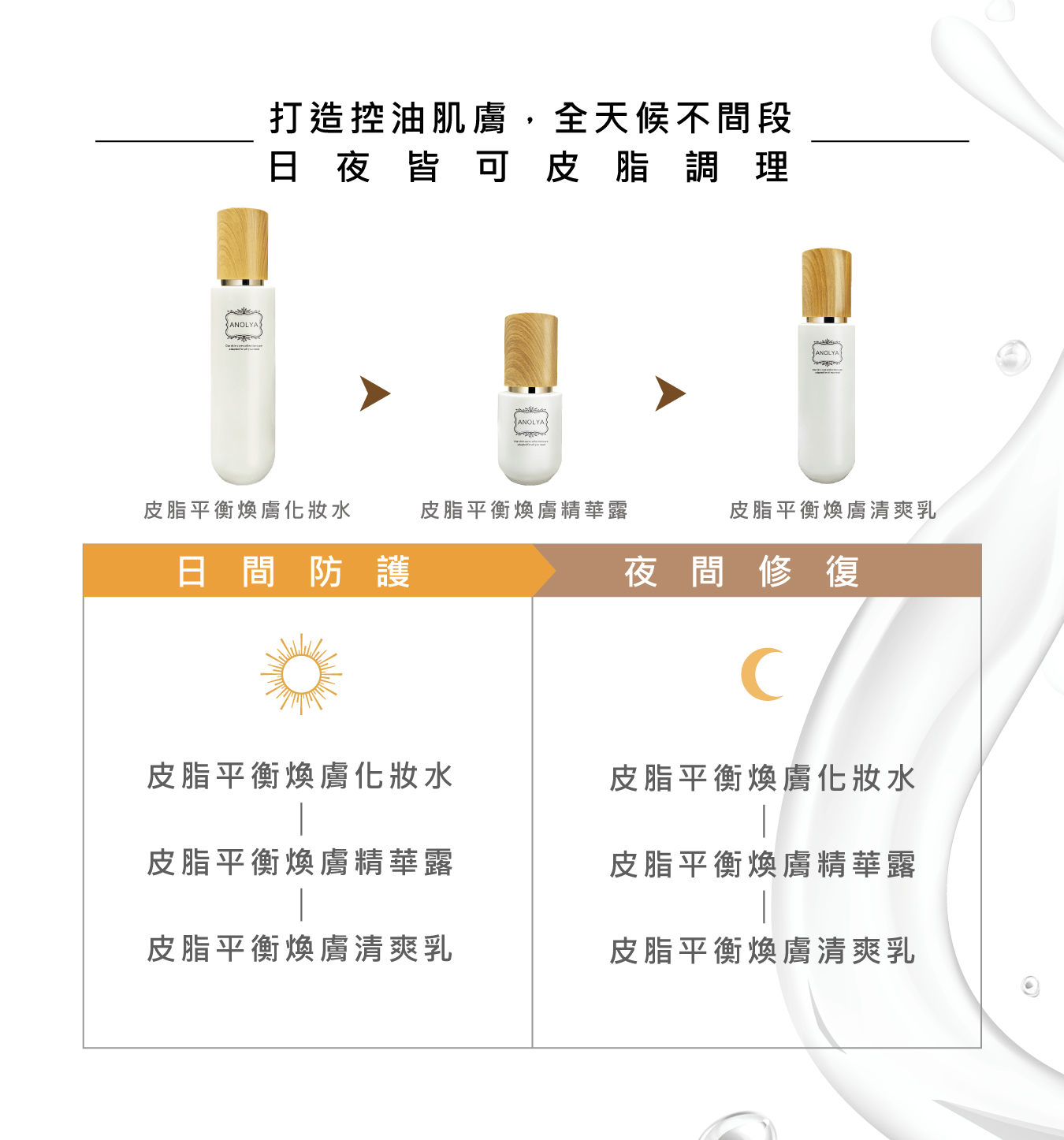 調理平衡油脂分泌,針對肌膚皮脂分泌的部位加以改善, 並添加鎖水成分,啟動補水、鎖水程序,常保肌膚的健康與美麗。