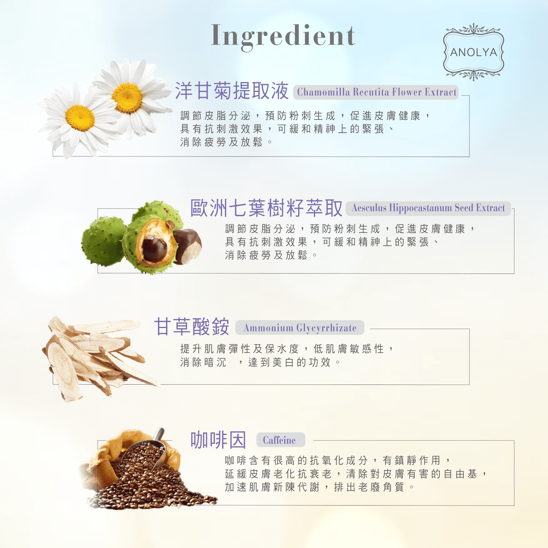 洋甘菊提取物、甘草酸銨、咖啡因、葡糖酸鋅、歐洲七葉樹籽萃取