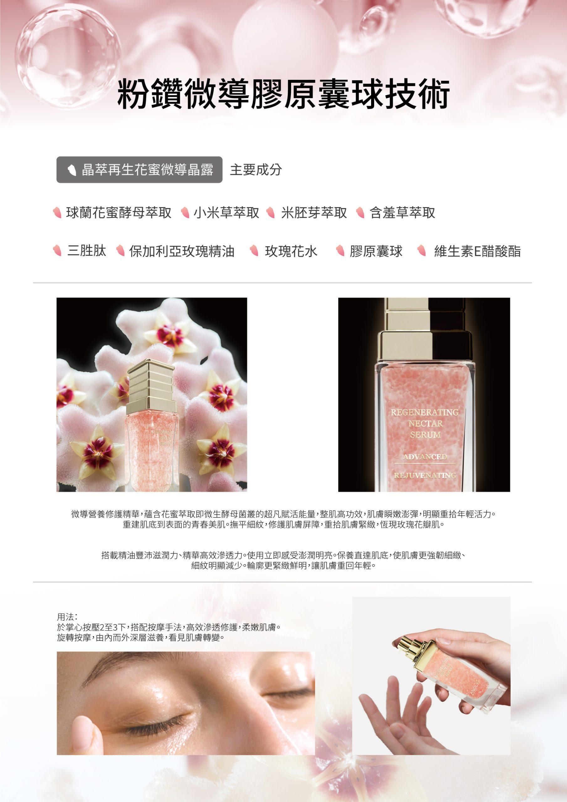 搭配豐沛滋潤力和精華高效的滲透力, 將營養注入肌底,逆轉歲月, 使肌膚更澎潤、更平滑,重拾肌膚年輕光彩。