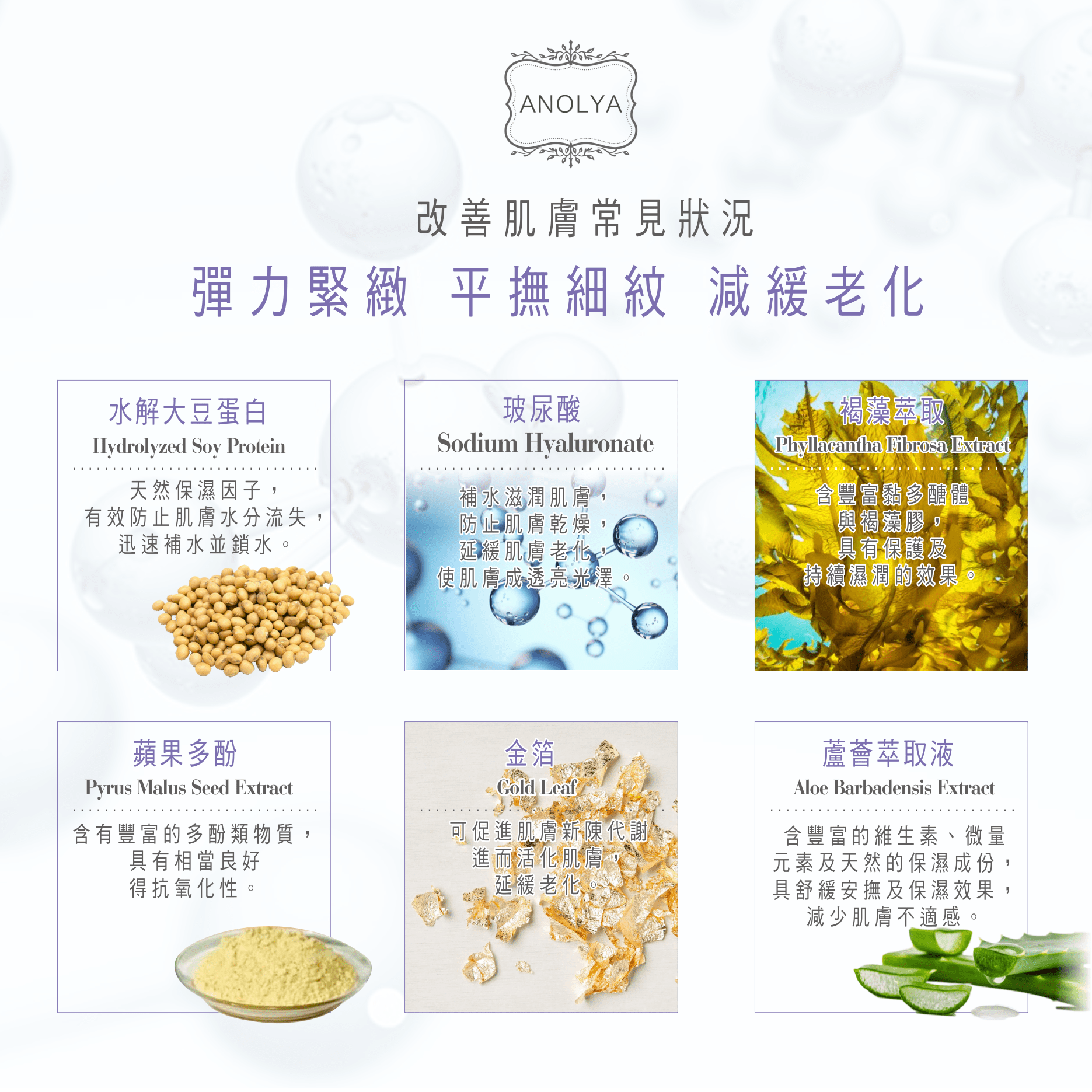 金箔、玻尿酸、水解大豆蛋白、蘋果多酚、褐藻萃取、蘆薈萃取液、金縷梅萃取液