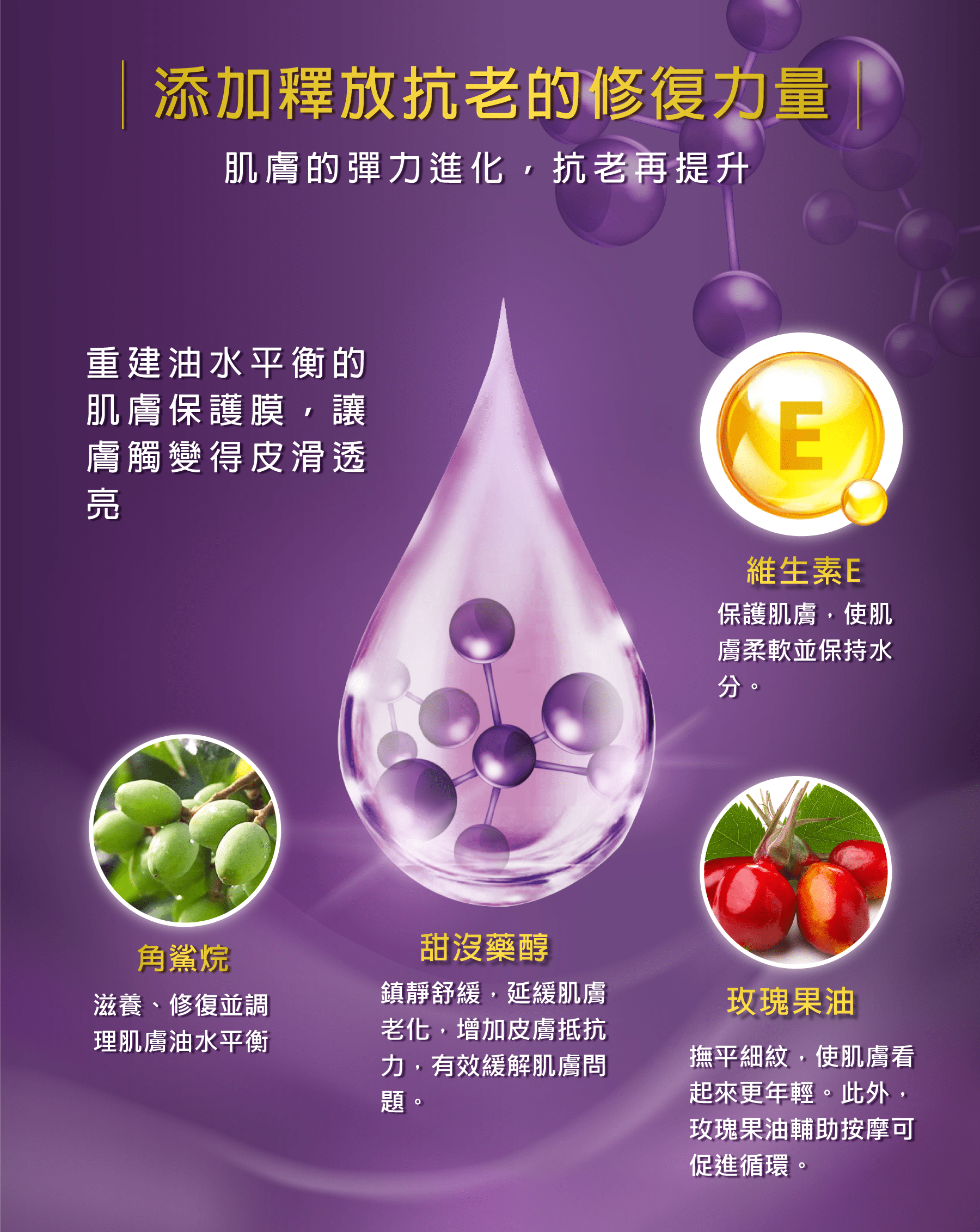 蠶絲油、玫瑰果油、角鯊烷、維他命E、甜沒藥醇