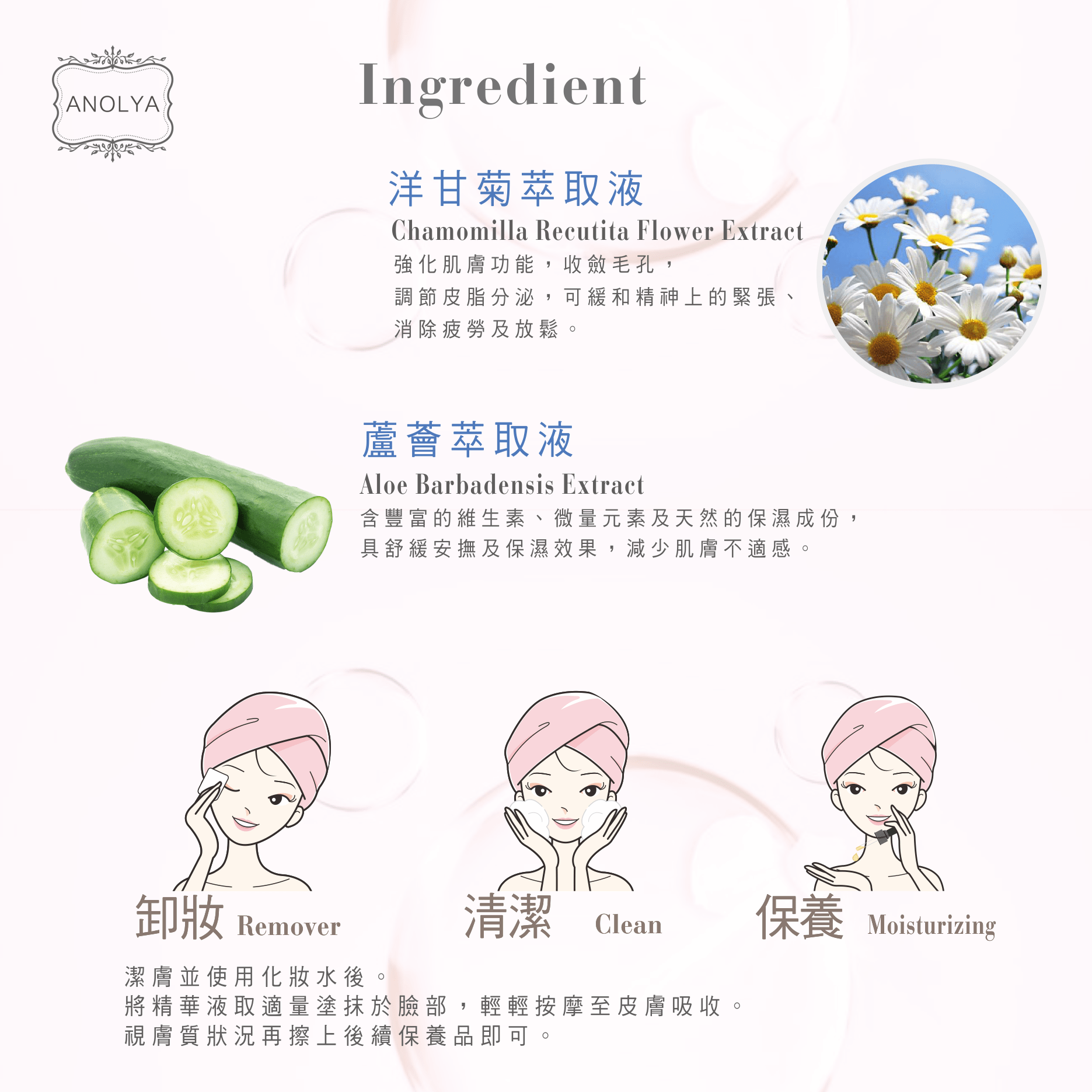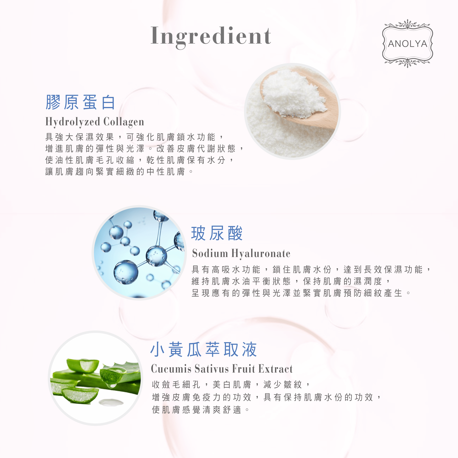 膠原蛋白、玻尿酸、蘆薈萃取液、小黃瓜萃取液、洋甘菊萃取液
