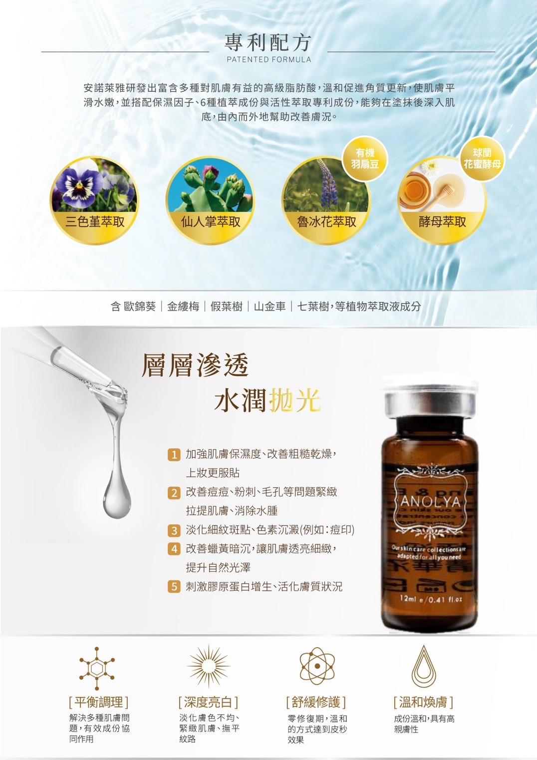 三色堇萃取、仙人掌萃取、魯冰花萃取、酵母萃取、歐錦葵萃取、七葉樹萃取、金縷梅萃取、假葉樹萃取、山金車萃取、蘋果酸、杏仁酸、水楊酸、玻尿酸