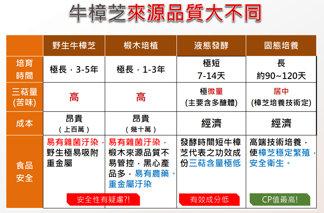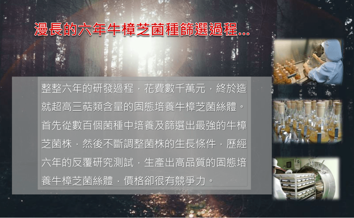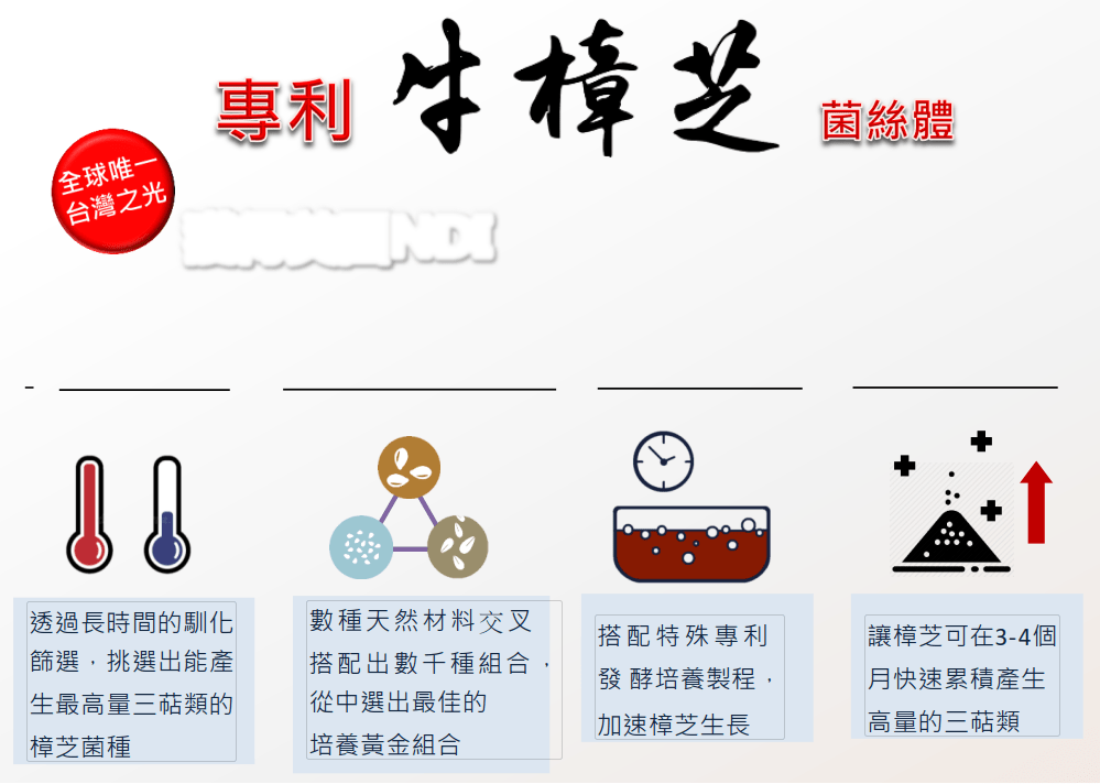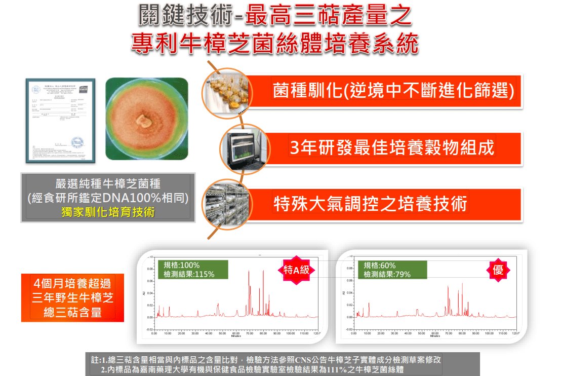 內 容 物:牛樟芝菌絲體(Antrodia cinnamomea 固態培養)、美國啤酒酵母粉(含維生素B群)、日本蜆萃取(蜆萃取、木薯糊精)、微結晶狀α-纖維素、薑黃萃取粉、日本專利米糠萃取(含甘蔗元素)、磷酸鈣、黑胡椒萃取胡椒鹼。