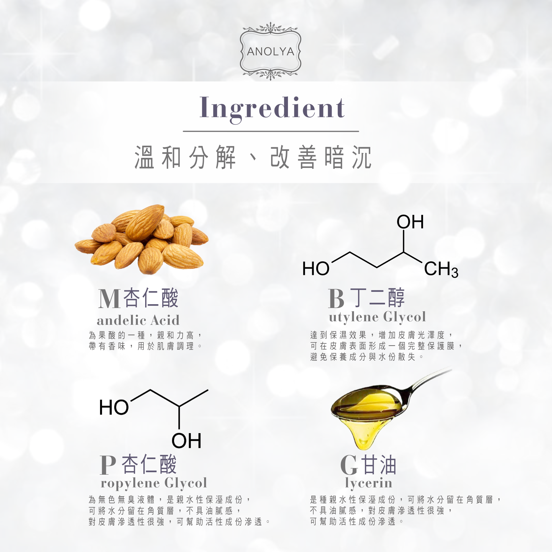 杏仁酸、甘油、丁二醇、丙二醇