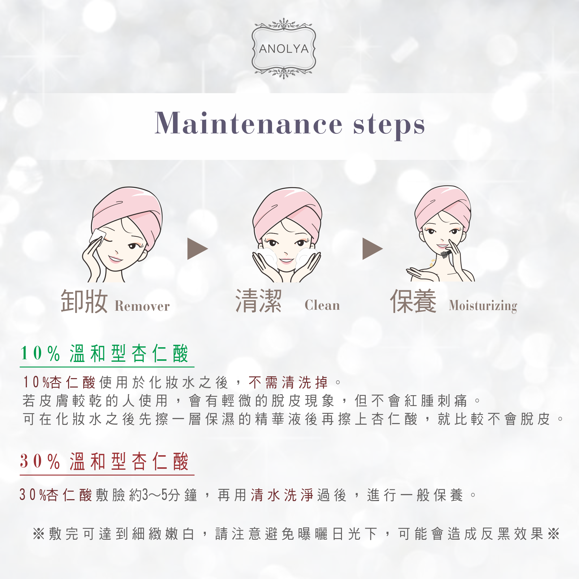 卸妝 →潔臉 →補水 (化妝水) →杏仁酸換膚 →清水洗淨→保濕修護 →防曬