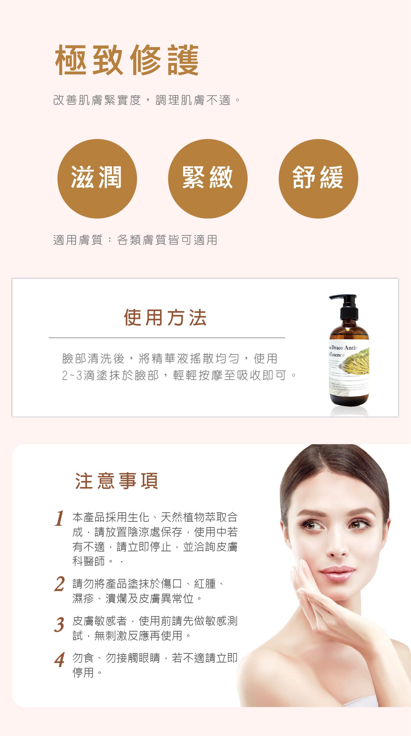 皮膚敏感者建議先於手臂內側做敏感性測試,無刺激反應再使用。限外用,如有不適請停止使用,並連絡皮膚科醫師。