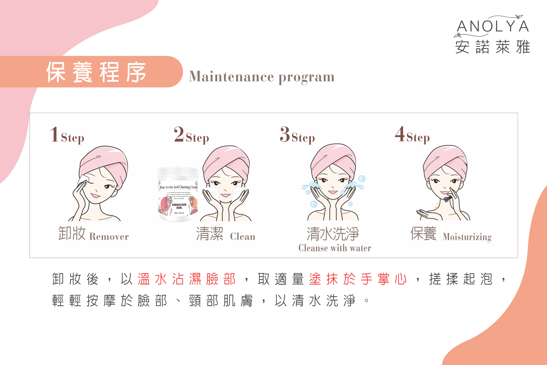 卸妝後,以溫水沾濕臉部,取適量塗抹於手掌心,搓揉起泡,輕輕按摩於臉部、頸部肌膚,以清水洗淨。