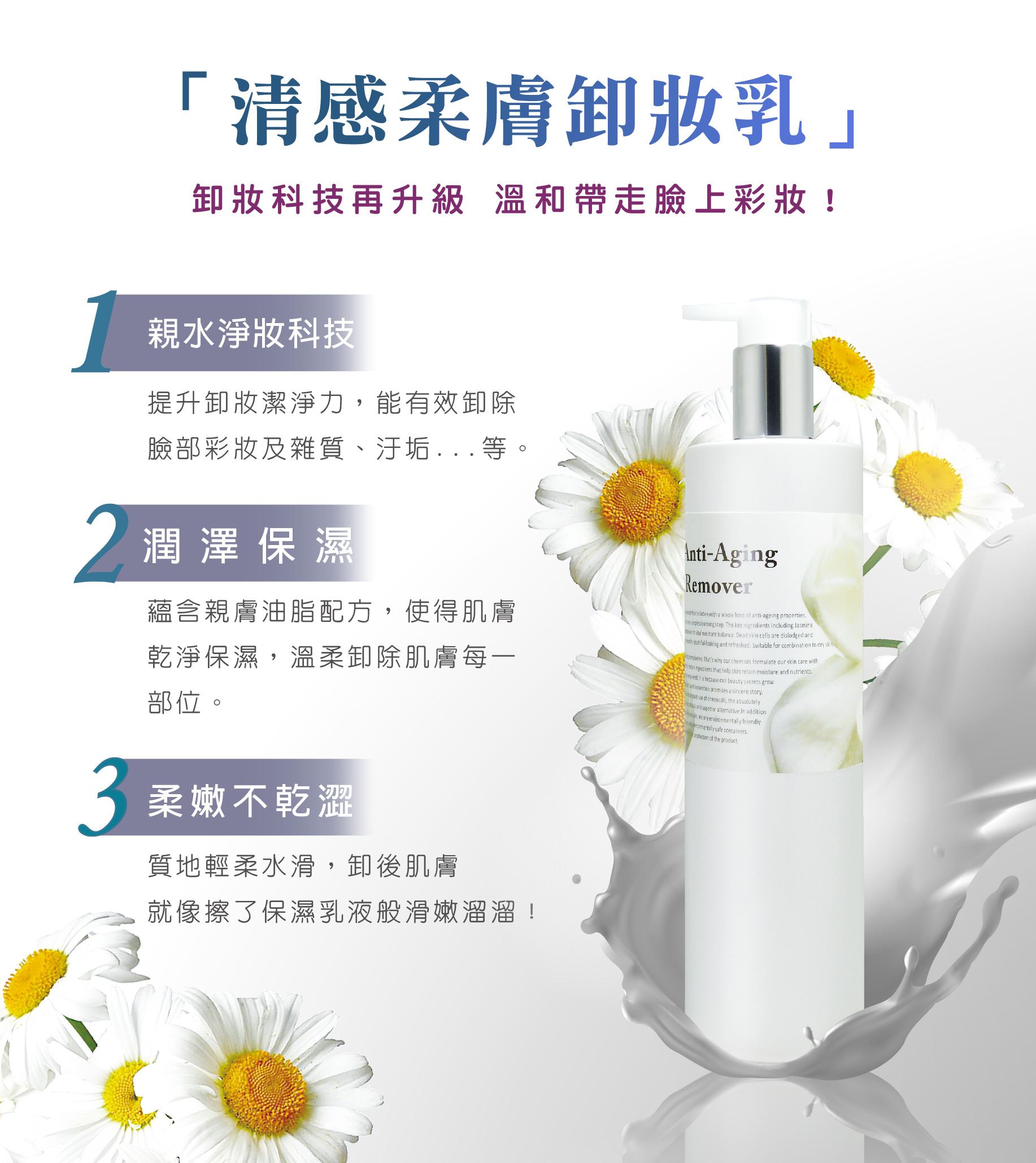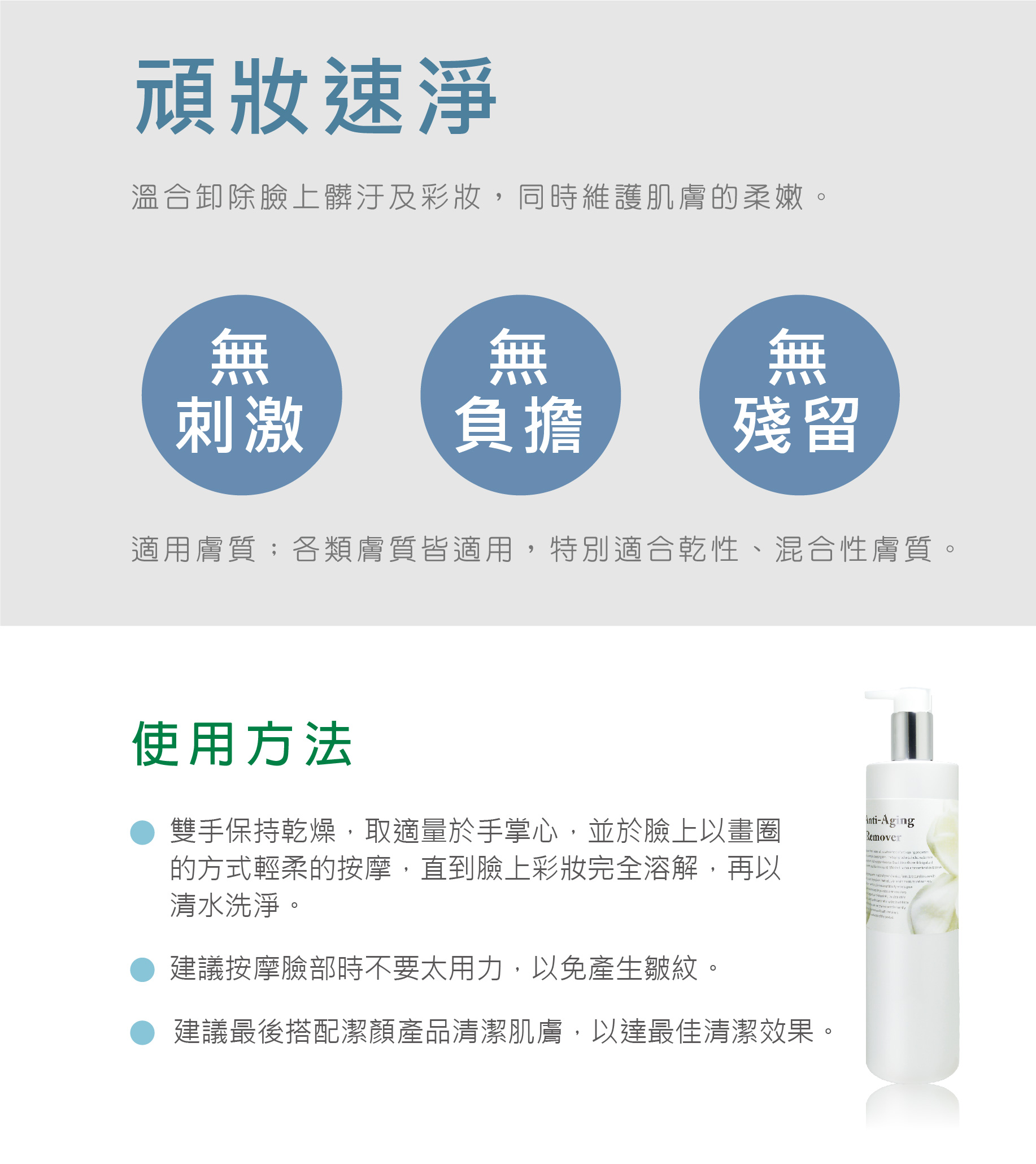 溫合卸除臉上髒汙及彩妝,同時維護肌膚的柔嫩。