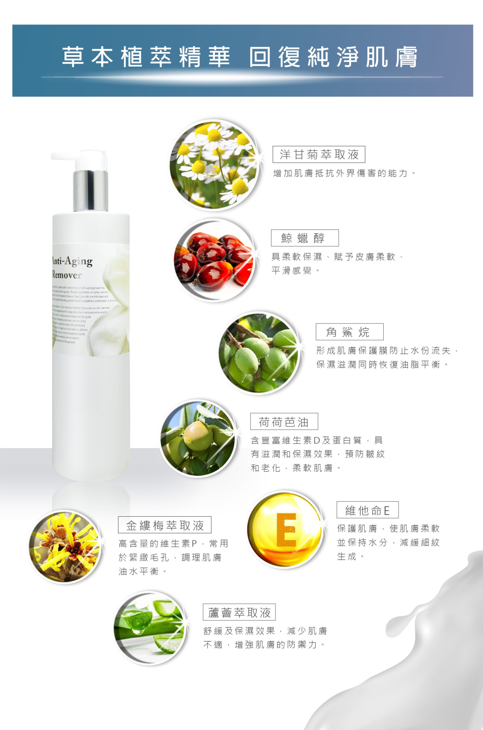 洋甘菊萃取、角鯊烷、荷荷芭油、金縷梅花水、蘆薈萃取