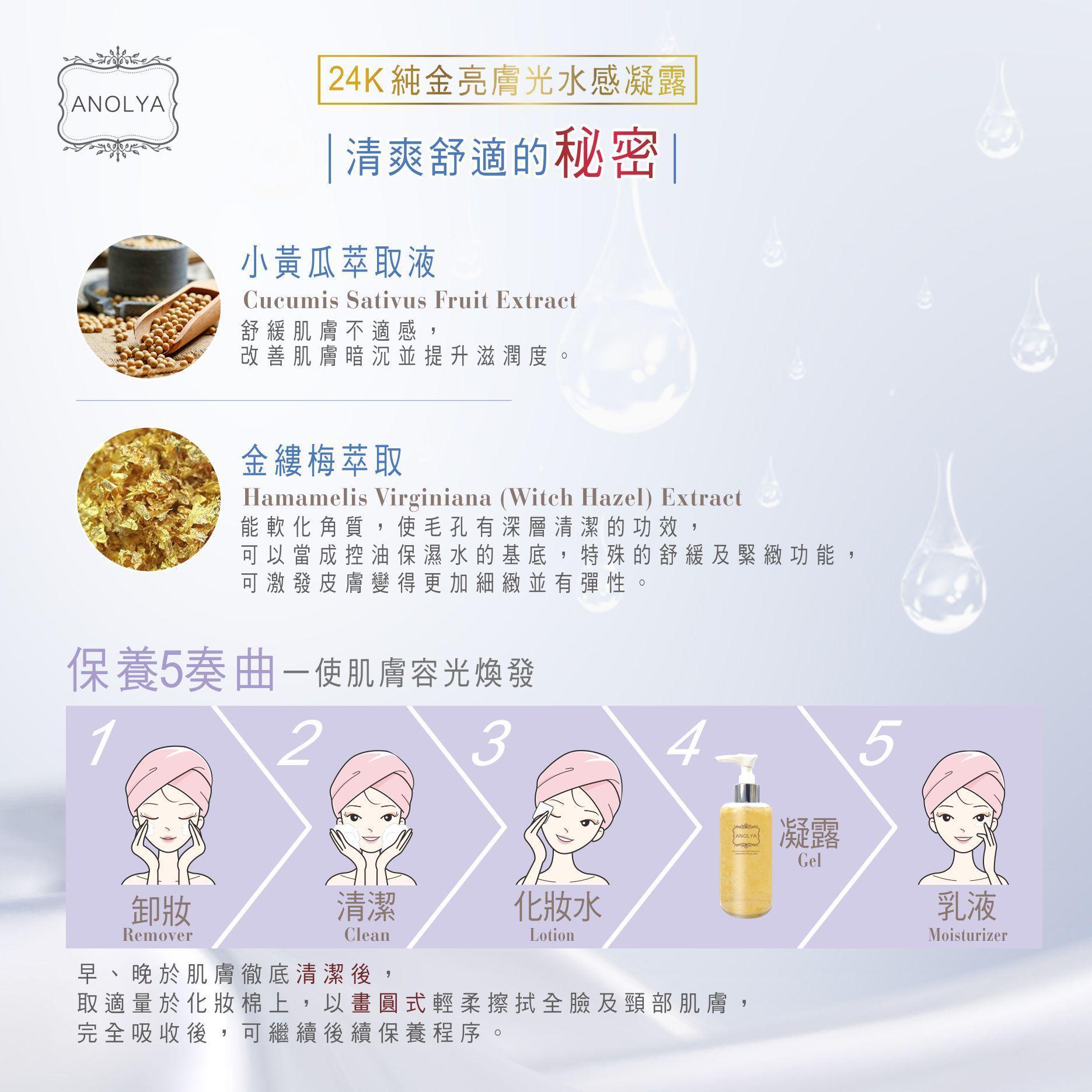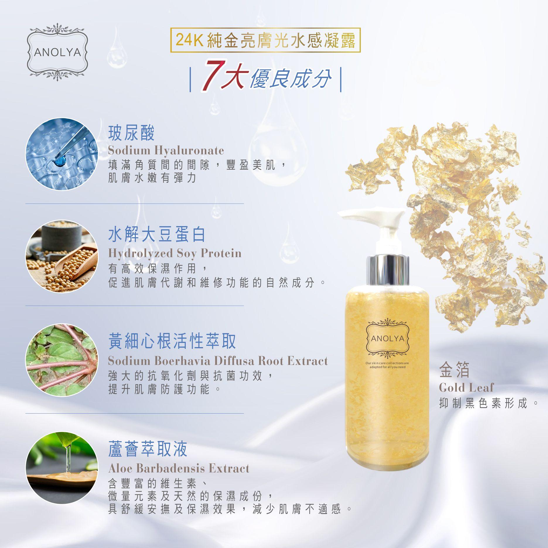 金箔、水解大豆蛋白、黃細心根萃取、 玻尿酸鈉、小黃瓜萃取、金縷梅花水、蘆薈萃取