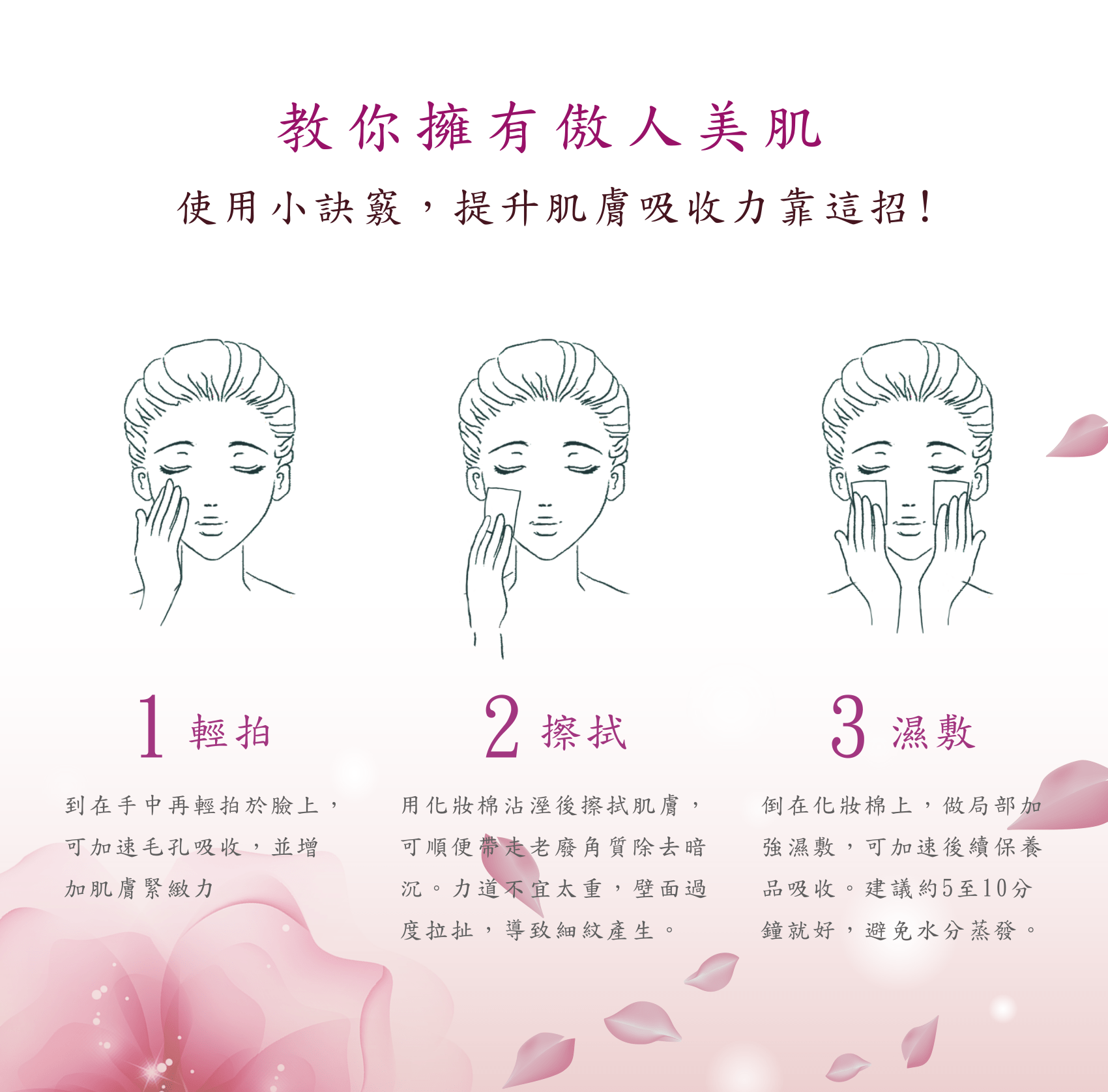 於卸妝、清潔後使用。以化妝棉沾取適量的化妝水,於全臉及頸部輕輕擦拭; 或噴於臉部及頸部,再輕拍至吸收即可,也可搭配化妝棉濕敷調理肌底。