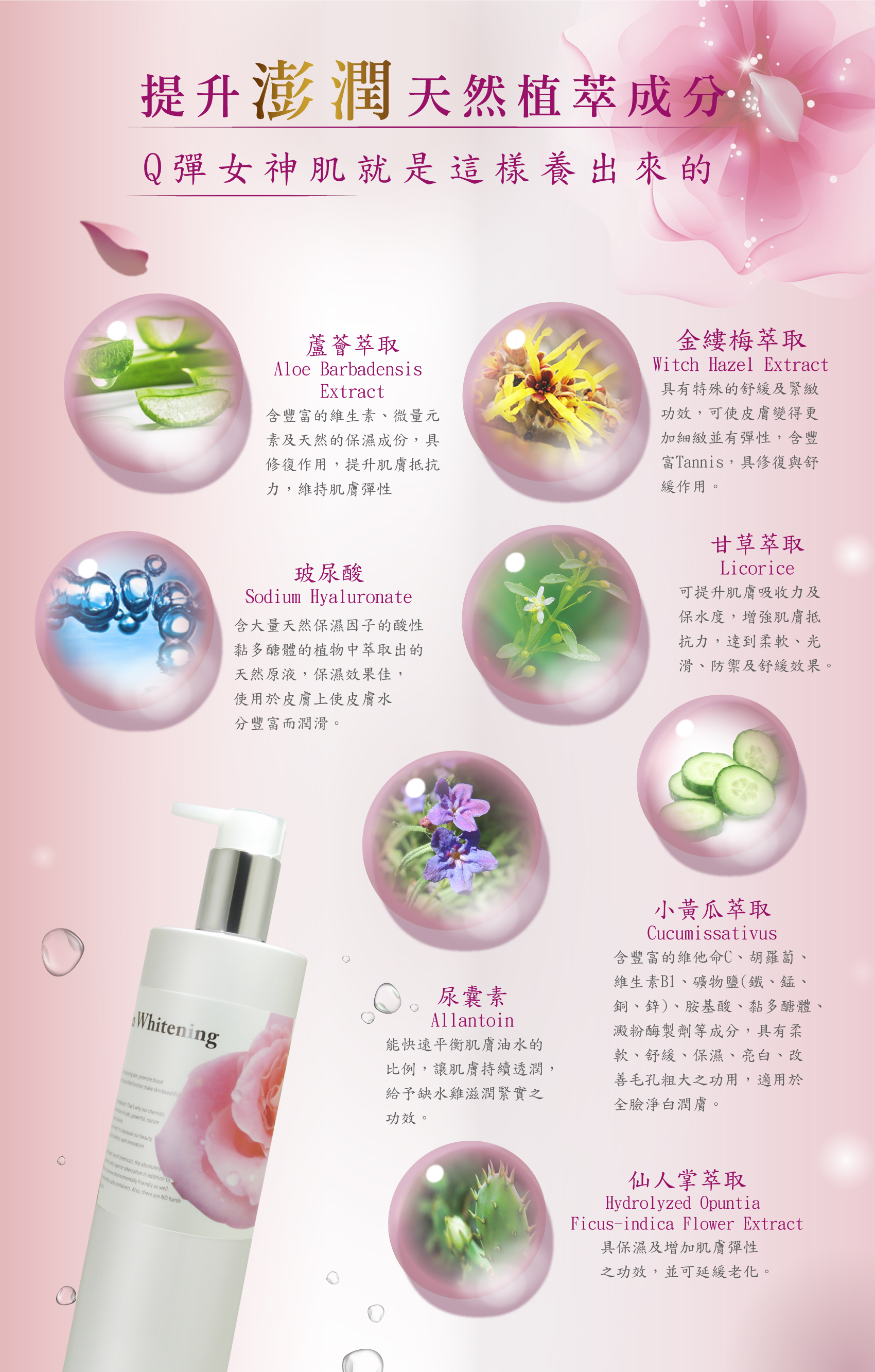 角鯊烷、蘋果萃取、蘆薈萃取、甘草萃取、金縷梅純露、玻尿酸鈉