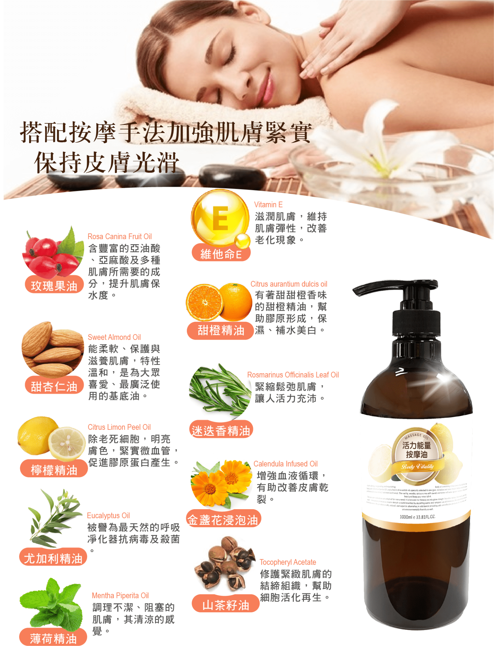 結合多項複方精油配方,藉由按摩過程中, 舒緩身體肌肉,溫暖和強化身心機能, 激勵循環同時均勻膚色,消除身體疲勞, 蓄滿精力,舒緩心靈壓力。