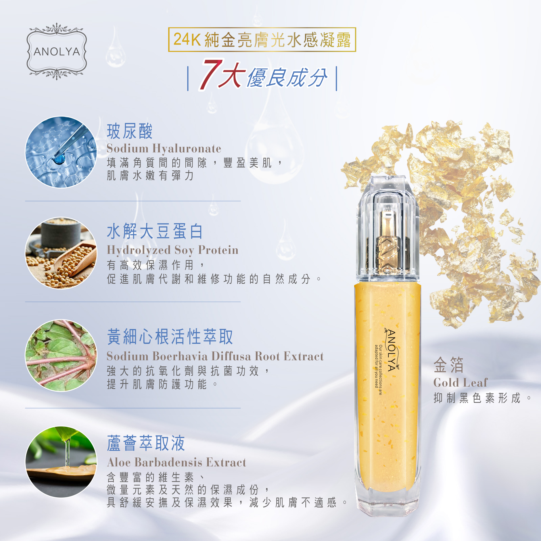 金箔、水解大豆蛋白、黃細心根萃取、 玻尿酸鈉、小黃瓜萃取、金縷梅花水、蘆薈萃取
