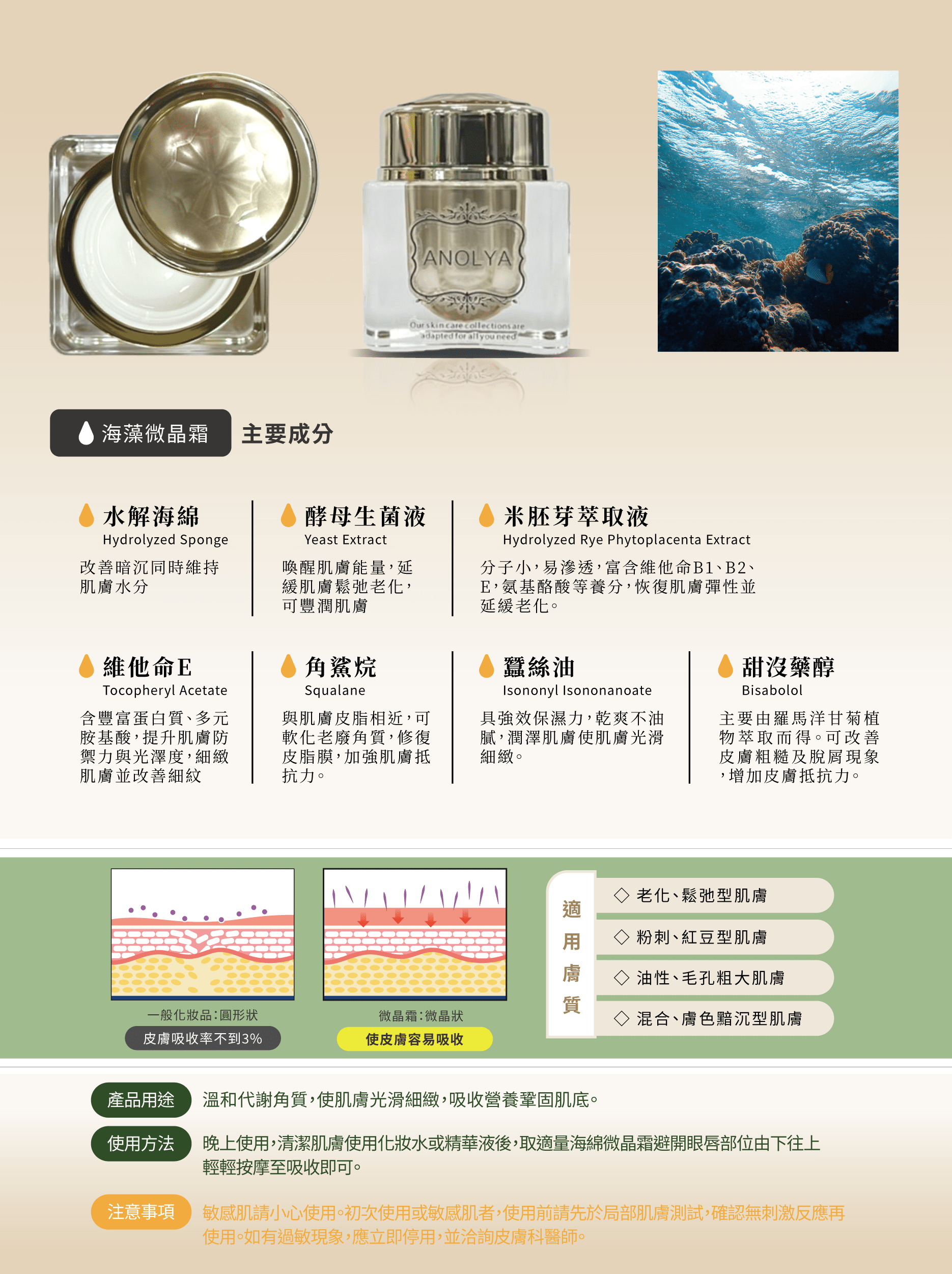 蠶絲油、水解海綿、角鯊烷、玫瑰油、二裂酵母原液(比菲德氏菌、雙叉乳桿菌)、甜沒藥