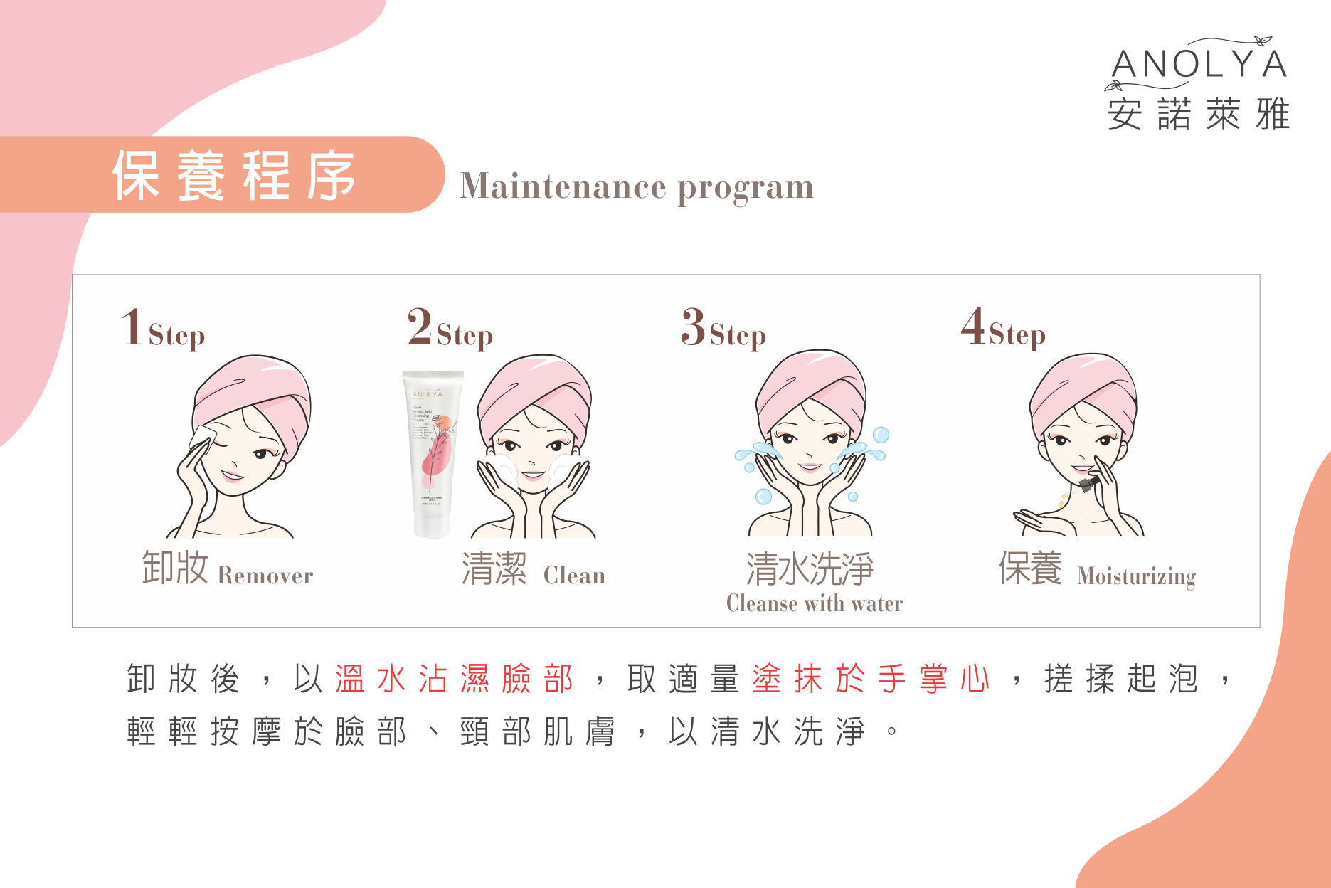 卸妝後,以溫水沾濕臉部,取適量塗抹於手掌心,搓揉起泡,輕輕按摩於臉部、頸部肌膚,以清水洗淨。