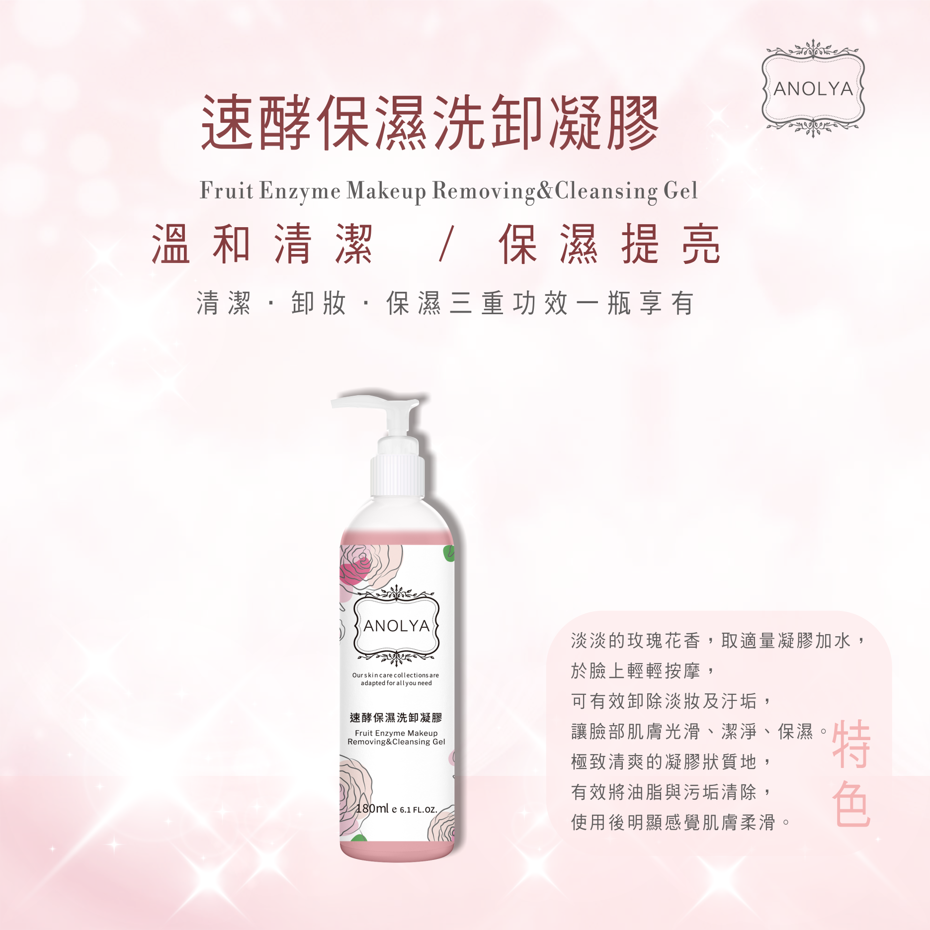 溫和洗臉卸妝不殘留,賦予肌膚潔淨與滋潤,加強調理並保濕肌膚,使肌膚恢復水嫩光澤,不油膩,零殘妝 。