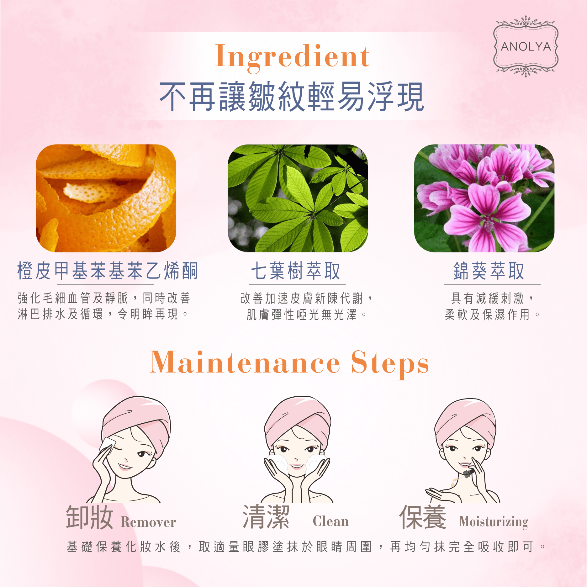 基礎保養化妝水後,取適量眼膠塗抹於眼睛周圍,再均勻抹完全吸收即可。