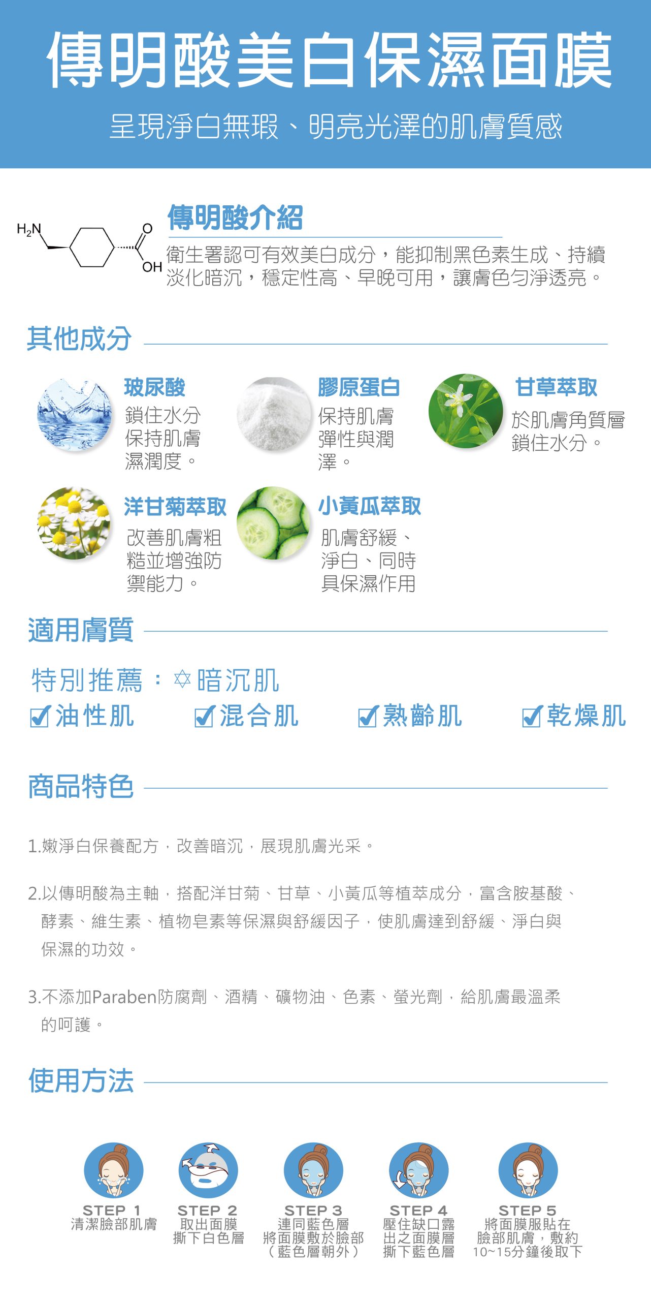傳明酸、蘆薈萃取、掌葉藻萃取、玻尿酸、小黃瓜萃取、洋甘菊萃取