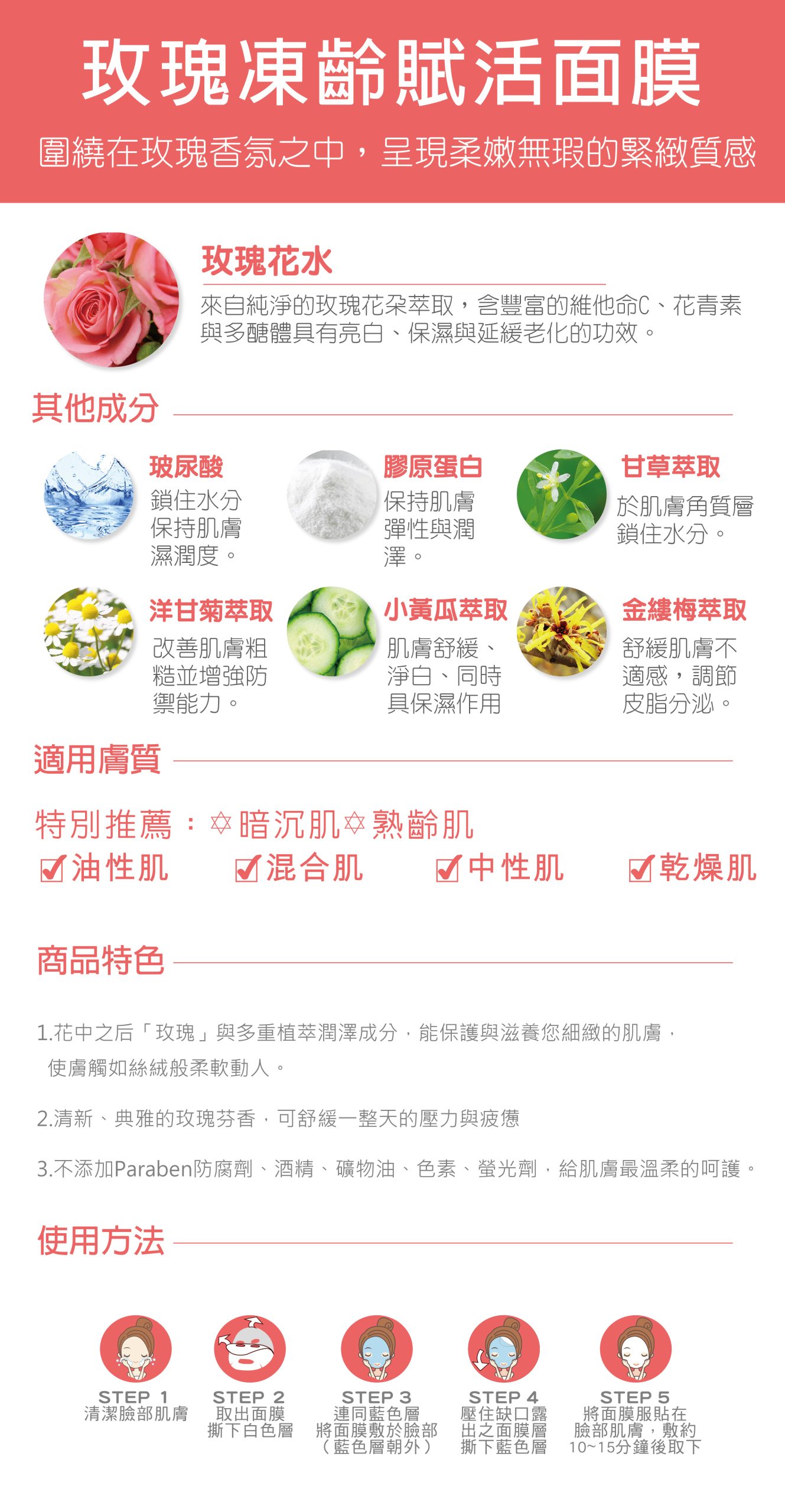 保加利亞玫瑰油、玻尿酸、洋甘菊萃取、金縷梅萃取、小黃瓜萃取、蘆薈萃取