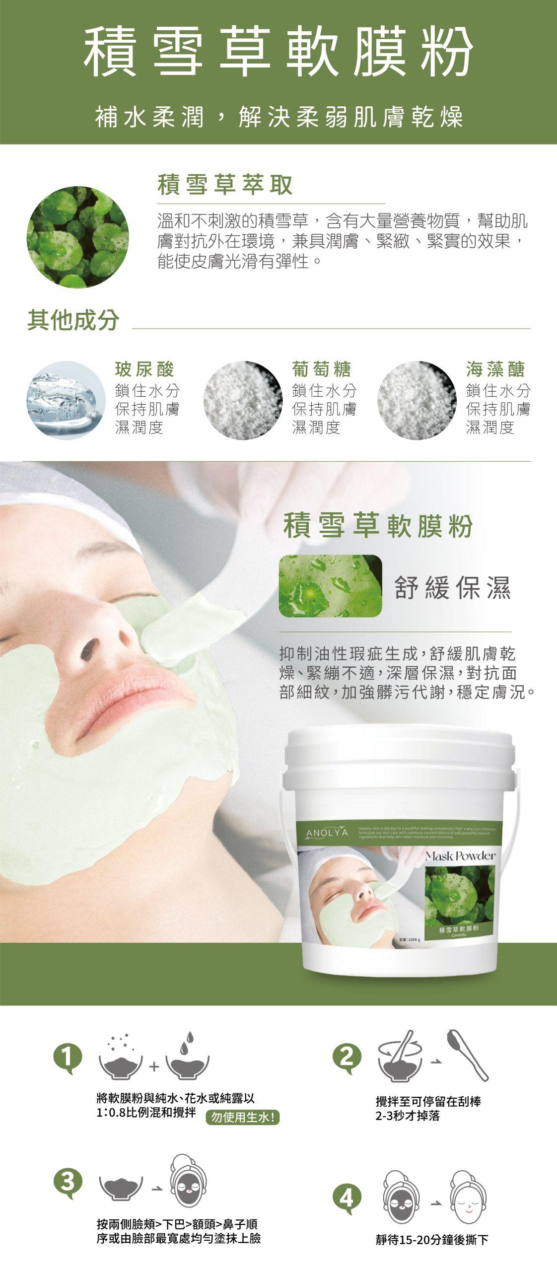 1. 將軟膜粉與純水、花水或純露以1:0.8比例混和攪拌