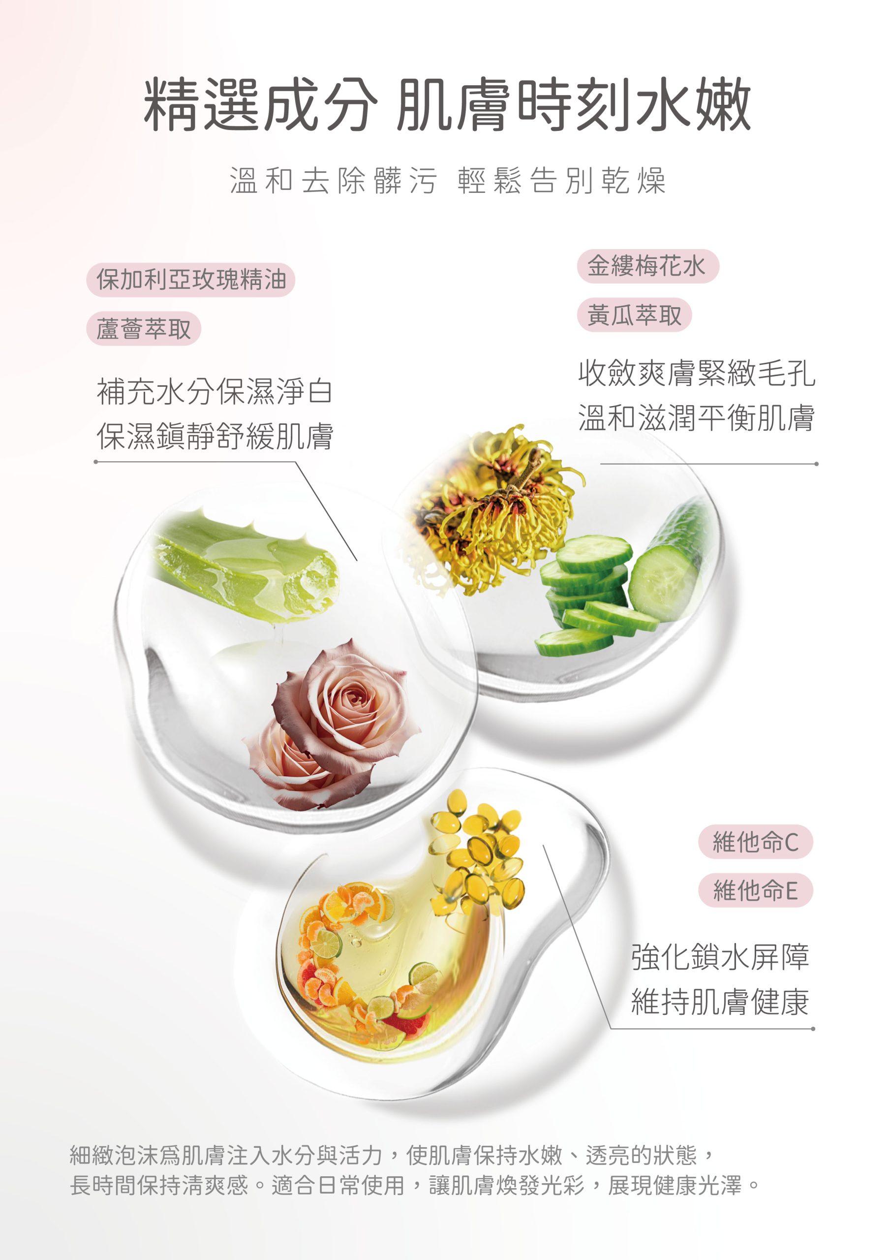 輕柔潔淨肌膚,同時深層保濕,舒緩肌膚不適。 細緻泡沫可有效去除臉部髒污與油脂,並溫和潔淨肌膚,保護肌膚屏障。 為肌膚注入水分與活力,保持水嫩、透亮的狀態,長時間保持清爽感。