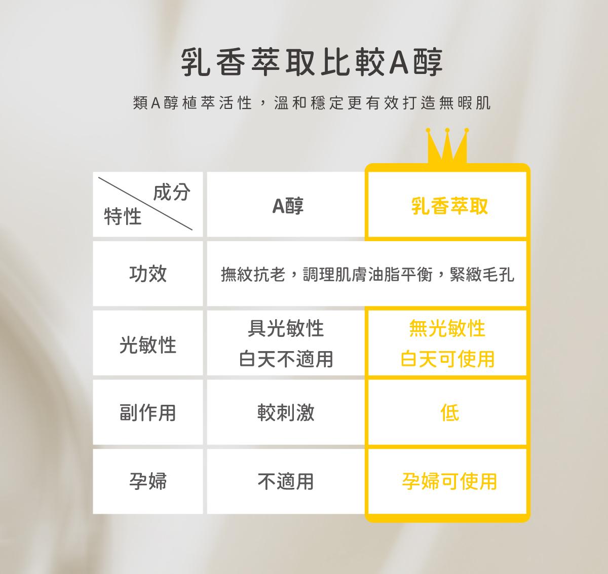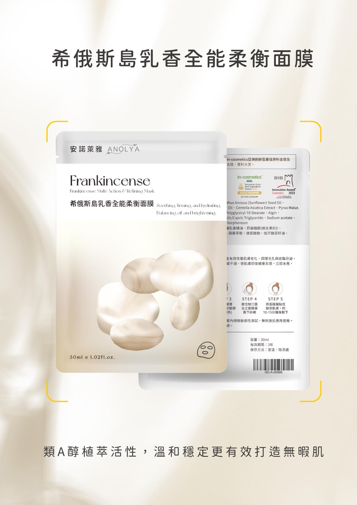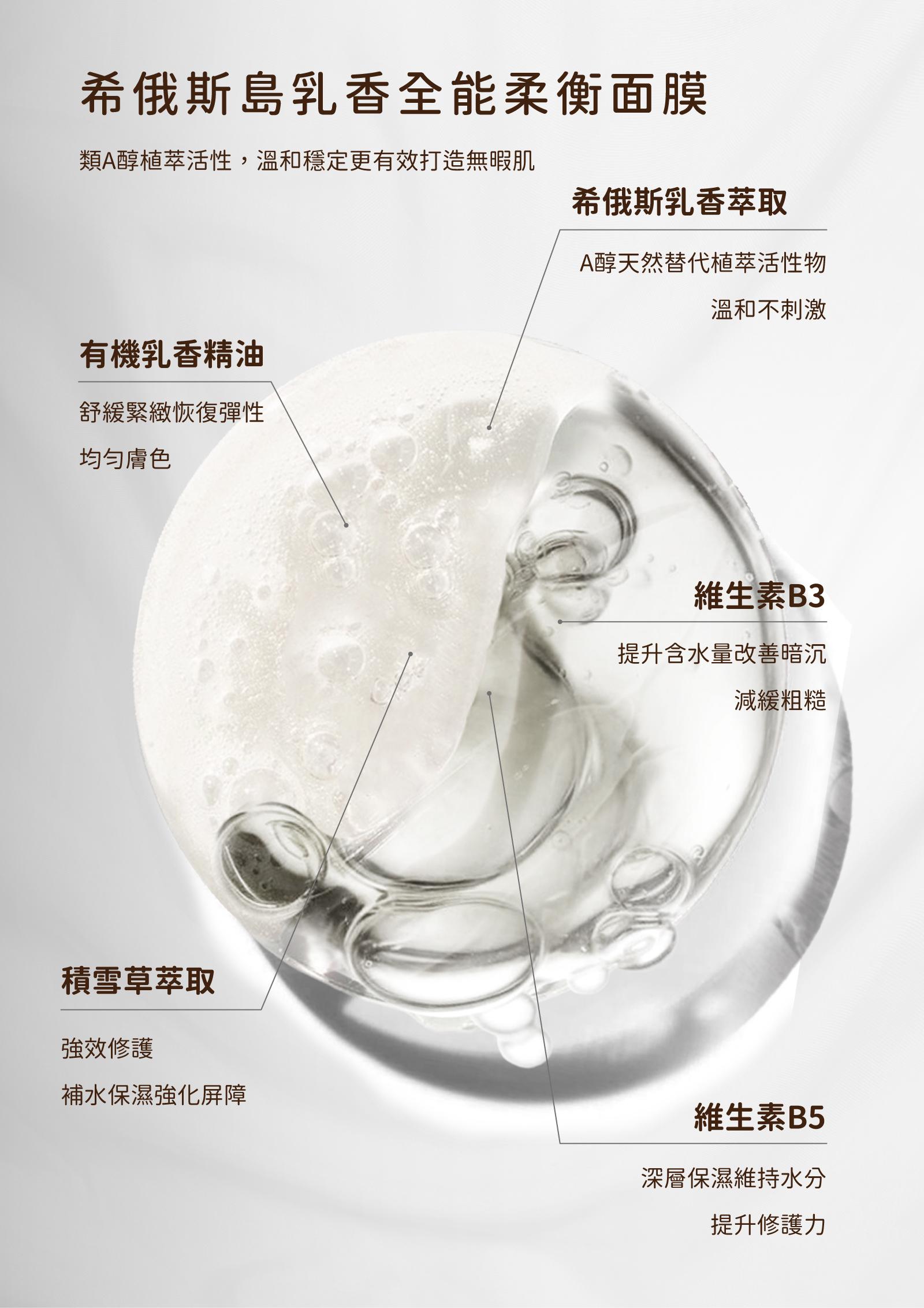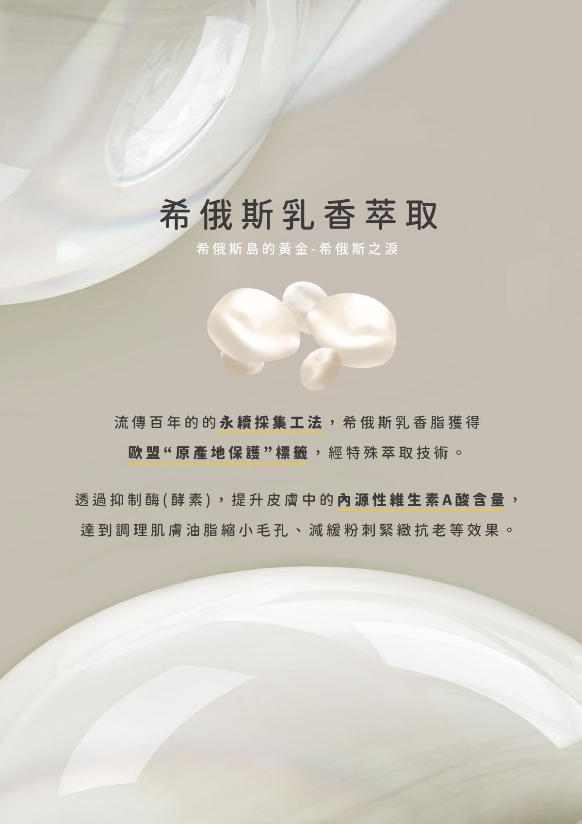 源於希俄斯乳香萃取,可為A醇的替代物,能有效改善肌膚老化,調理毛孔與皮脂分泌,並減少肌膚細紋,搭載積雪草萃取強效修護、舒緩不適,使肌膚回復健康澎潤,立即水量,長效保濕。