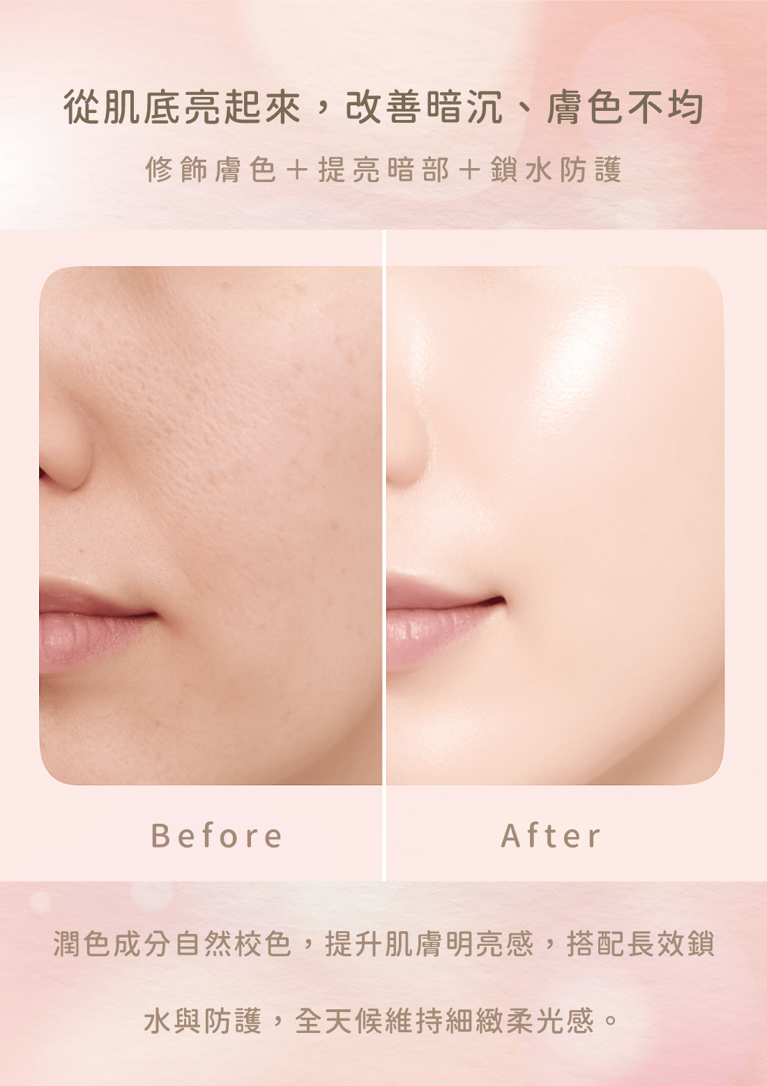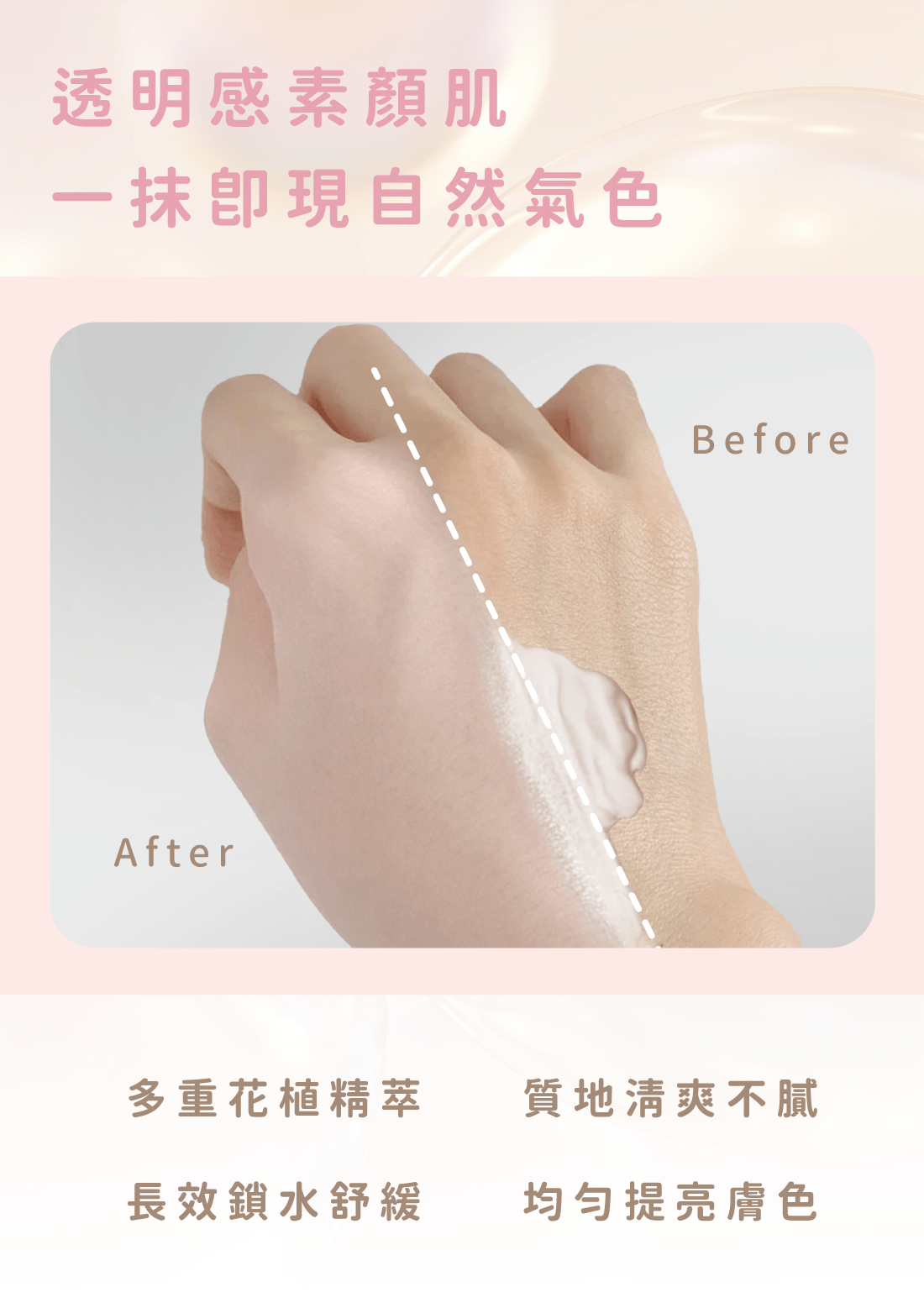 早上保養後取適量塗抹於全臉,可單擦展現自然潤色光澤,亦可作為妝前潤色打底使用。