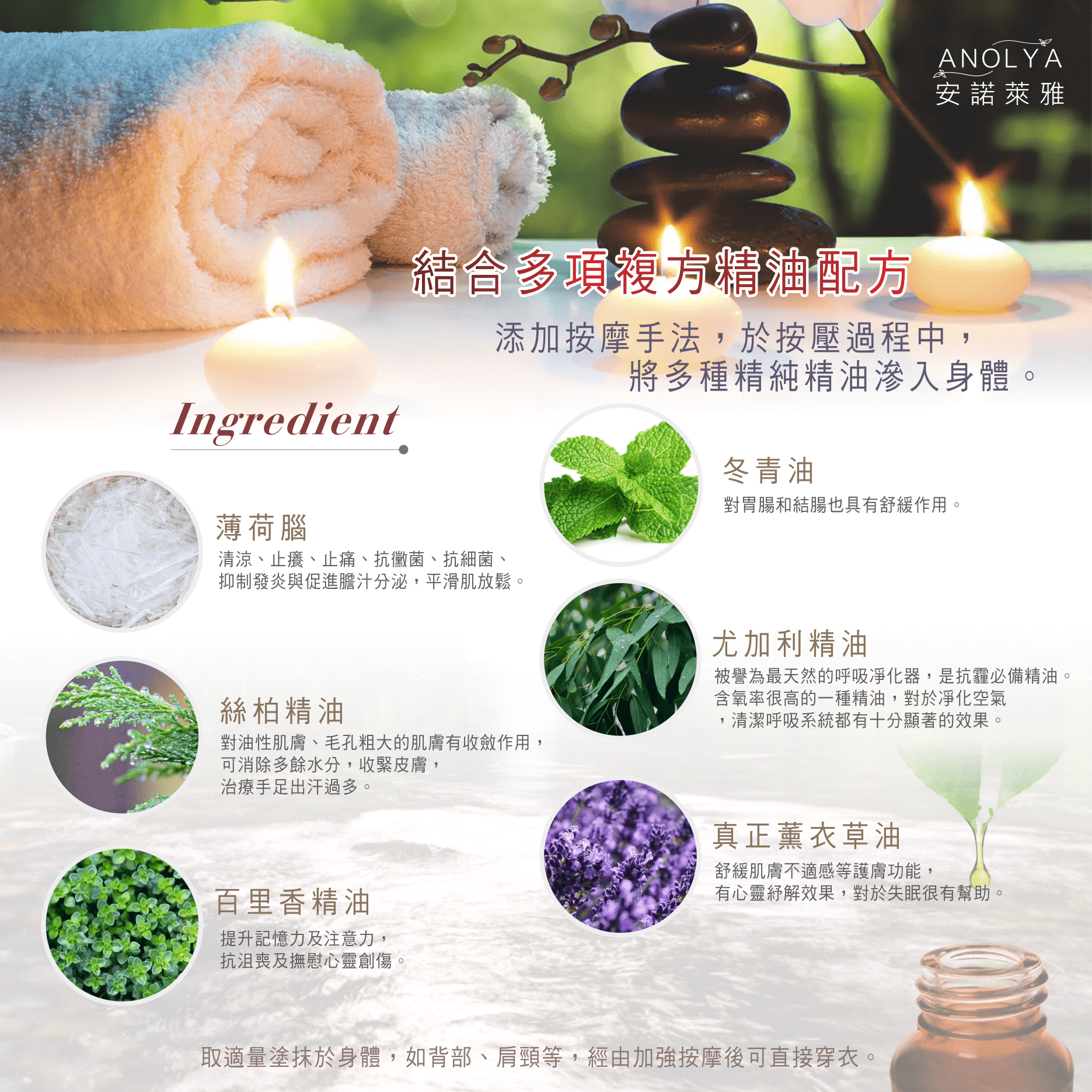 取適量塗抹於身體,如背部、肩頸等,經由加強按摩後可直接穿衣。