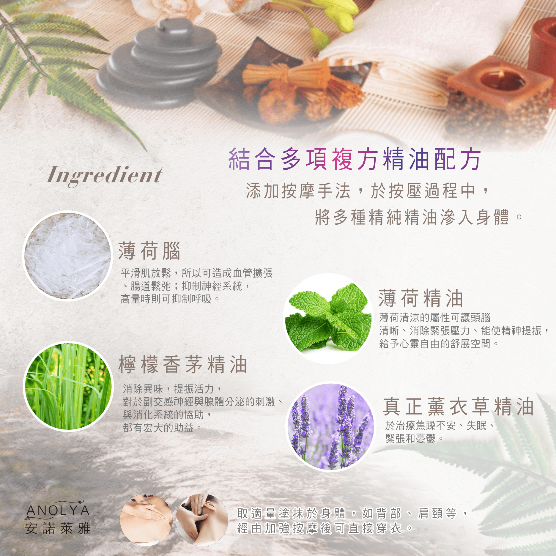 薰衣草精油、薄荷精油、檸檬香茅精油、薄荷腦