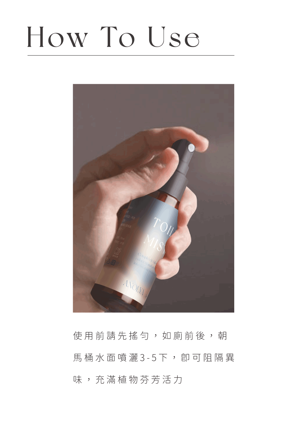 使用前請先搖勻,如廁前後,朝馬桶水面噴灑3-5下,即可阻隔異味,充滿植物芬芳活力。